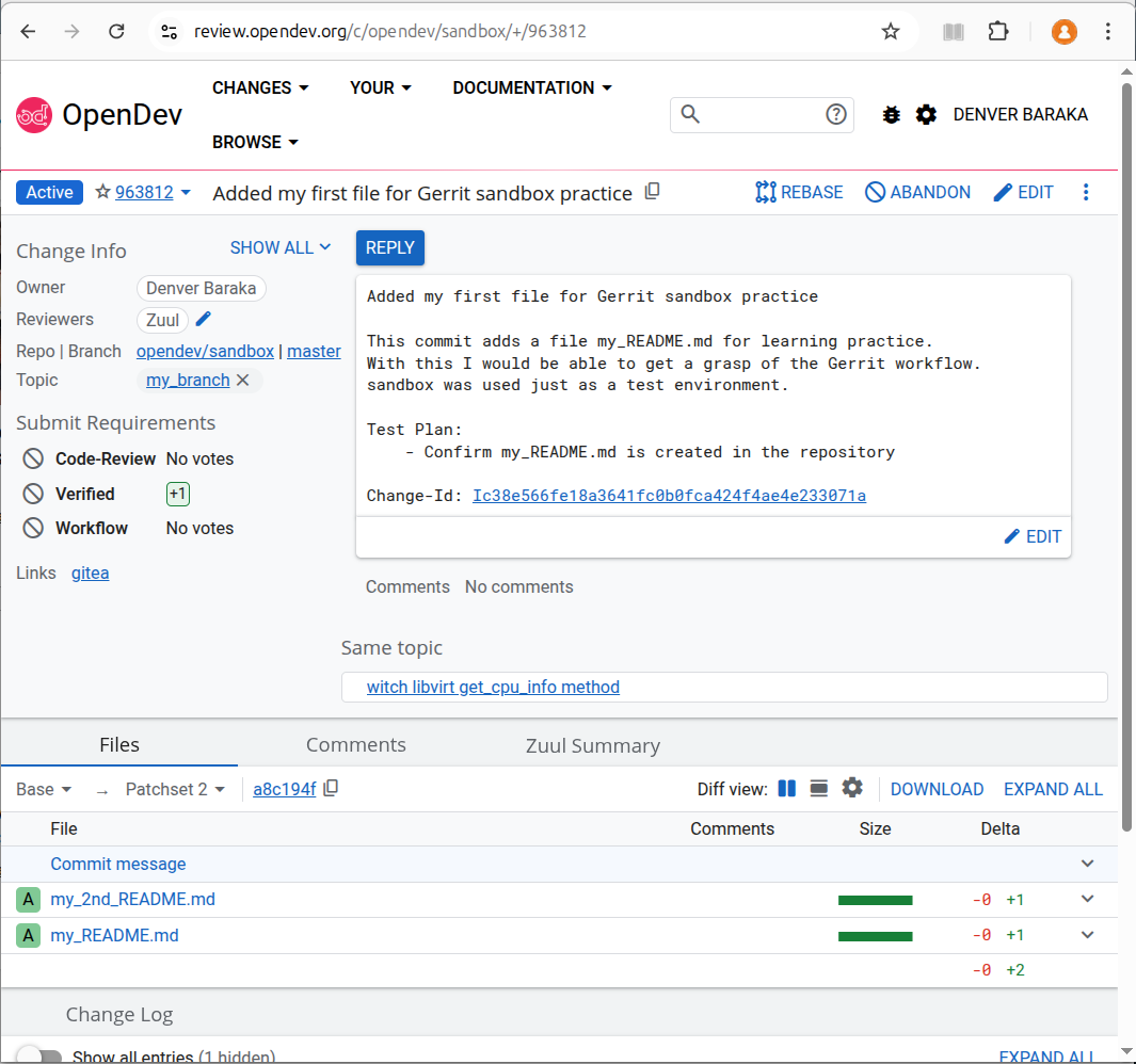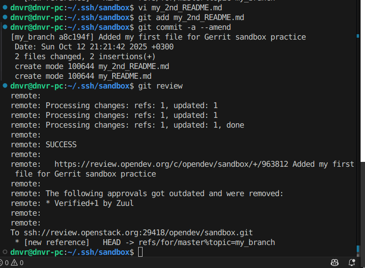here is the link for my first change submitted for review https://review.opendev.org/c/opendev/sandbox/+/963812